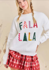 Spread some holiday cheer and style with the FALA LALA Knit Sweater Top. This playful and cozy white knit pullover features colorful embroidered lettering in festive prints like candy cane stripes and snowflakes. Made with soft acrylic fabric, it's perfect for everything from parties to relaxing by the fire. Embrace the festive spirit and stay cozy all season long!