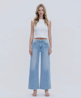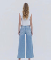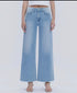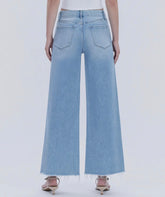 Flying Monkey-LIGHT WASH SEAMLESS WAISTBAND RAW HEM WIDE LEG JEANS