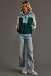 Stay cozy and stylish in our Color-block Vest! The soft, quilted top and Sherpa body will keep you warm, while the lt blue and green color-block design adds a playful touch. Perfect for those chilly days, this vest is a must-have for your wardrobe.